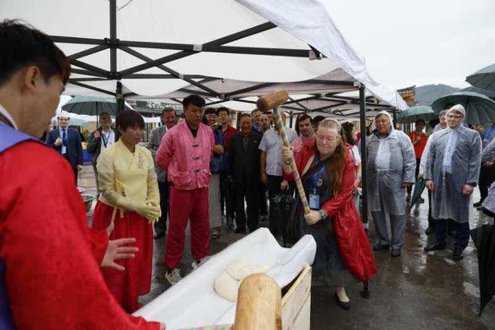 “好吃!”尝完自己亲手打出来的打糕,哈萨克斯坦驻华使馆参赞卡巴吉耶夫竖起了大拇指。