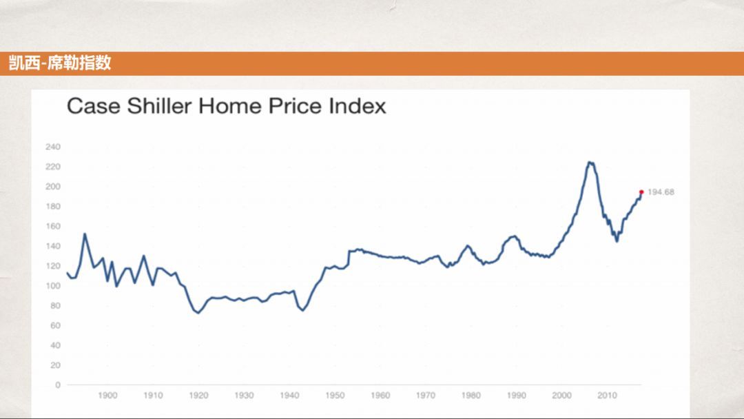 这张图就是标普凯西-席勒指数,这个指数统计1890年到2018年,指数是美国的平均房价按照1890年是一百来算。在抵消掉通货膨胀因素以后,房产价值也就是说从1890年到2018年,美国的房价在算上通货膨胀因素以后他增值了94.96%。