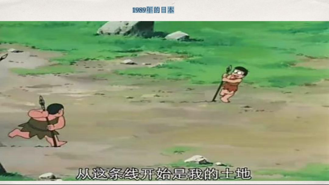 这个图是当时1989年藤子不二雄画的漫画——大雄与日本诞生,这部漫画讲的就是当时大雄还有胖虎他们在日本生活压力很大,天天上学,考试考不好,还要上课外班。然后大熊就跟多啦A梦说,拿时光机把我们放回到五千年前的日本,让我们重新去开发,日本要建立一个美好的国家。然后他们坐着时光机回到五千年前。