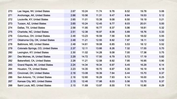 我们再看房价排名,最后这些城市全都是美国城市,包括一些大城市像达拉斯,休斯顿,拉斯维加斯。基本上在这些城市,平均家庭收入两年多就可以买一个均价房。休斯顿平均需要2.3年,休斯顿平均家庭收入大概就是不到六万美元,平均房价也就十几万美元。租金回报用6.97年就可以回本。这是毛租金,这些城市都有房产税的。