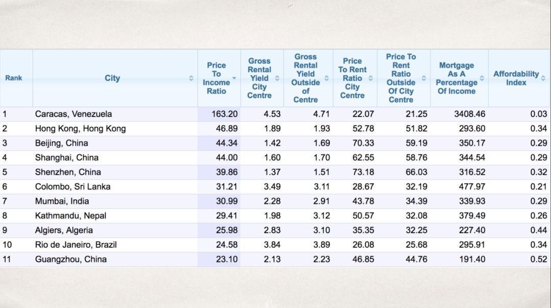 这个表是全世界房价排名前十一位的城市,其中有五个都是中国城市,香港,北京,上海,深圳,还有广州。当然排第一位的委内瑞拉的加拉加斯是因为恶性通货膨胀,这货币贬值96%,通货膨胀率达到了百分之一百三十万。相当于一万三千块钱,只能买一块钱的东西。