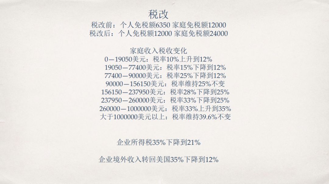 特朗普这个税改大概可以为美国人节税一点五万亿美元。企业所得税也从35%降到了21%,尤其是他鼓励美国企业把外国挣的钱转回美国,鼓励制造业回流,还有美元回流,所以当美国人的可支配收入上涨,再加上美国的海外的收入大量的汇回美国,所以对于整个房地产市场一定是利好的。