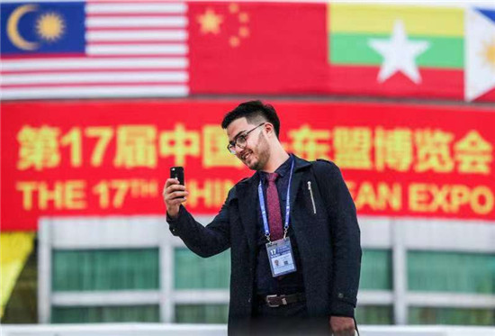 外国专业观众在南宁国际会展中心自拍。广西日报记者周军/摄