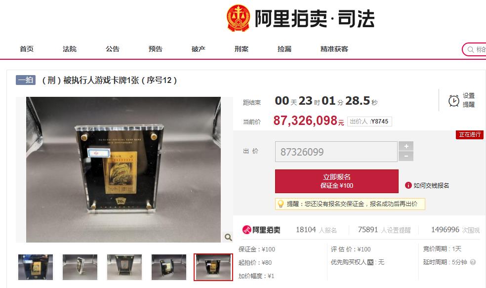 拍卖资料显示,此卡牌起拍价80元(人民币,下同),加价幅度1元,有18104人报名拍卖。此卡牌在拍卖开始半小时便突破6000万元,围观次数近150万。拍卖开始40分钟后,该卡牌竞拍价已接近9000万元……