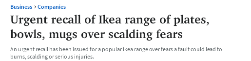 由于担心产品故障可能导致烧伤、烫伤或严重伤害,澳洲宜家6日宣布对Heroisk和Talrika牌的塑料产品发出紧急召回令。