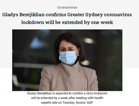 在疫情仍然严峻的情况下,新州州长贝瑞吉克莲(Gladys Berejiklian)7日证实,新冠肺炎疫情封锁将延长一周,原定于7月9日结束的大悉尼区、伍伦贡、Shellharbour、Blue Mountains和中部海岸的封锁将被延长至7月16日23时59分。