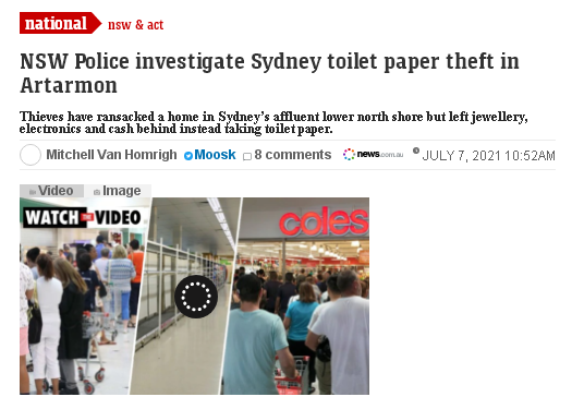 这起盗窃案的出现很有可能和悉尼进入了为期3周的封锁有关,封锁开始后,新州州长贝瑞吉克莲(Gladys Berejiklian)曾劝阻人们不要进行恐慌囤货,但这一建议被很大程度上忽视了。
