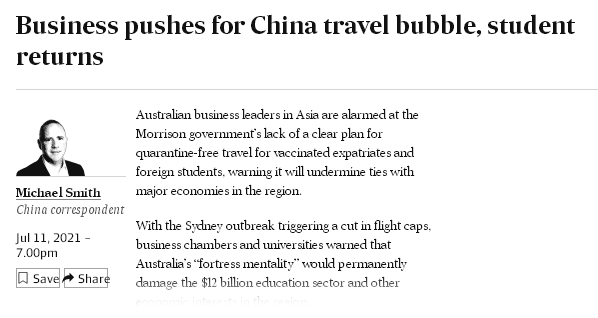 由于联邦政府没有为接种疫苗的外籍人士和外国留学生制定明确的免隔离入境计划,这让在亚洲的澳洲商界领袖感到震惊。他们警告说,这将破坏澳洲与该地区主要经济体的关系。另外,他们也指责称,澳洲政府自满且封闭的心态需要被及时改正。