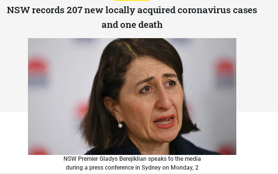 新州州长贝瑞吉克莲(Gladys Berejiklian)则敦促民众接种疫苗。她说:“在新州的重症监护室病房里,没有一个新冠患者接种过两剂疫苗。我可以强调,8月是我们所有人都应该前往接种疫苗的月份。几个月来我一直在说,80%的成年人口接种疫苗将使我们获得不再被封锁的,这相当于1000万剂疫苗接种量。"