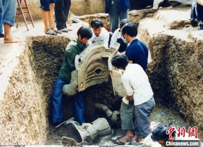1986年三星堆青铜纵目面具发掘现场。(三星堆博物馆供图)