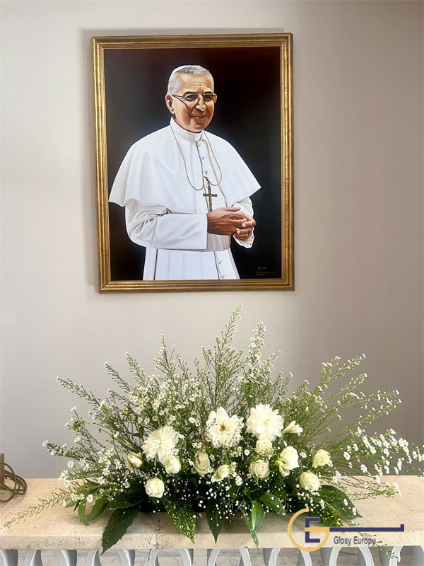 《微笑教宗》是张焰先生为教宗若望·保禄一世所绘的圣像。保禄一世教宗,又名卢奇亚诺(Luciani)。他为人十分谦逊、一生与人为善,是一位“简朴的圣人”。张焰先生用精湛的画技,将这位教宗对每一个人传达善意友谊的观念深深刻在了这幅圣像中。