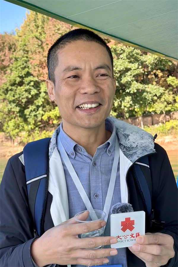 菲律宾商报财经编辑陈埏卫率先品尝了现场直取的万绿湖水,表示其口感新鲜清甜,「不愧是粤港人民的饮用水生命之源」。 (李紫妍摄)