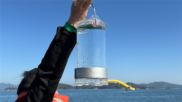 工作人员现场用专业取水器取出一壶约25米深处的万绿湖水。 (李紫妍摄)