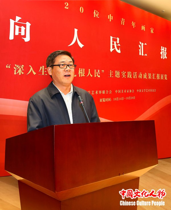 2016年10月14日,为纪念习近平总书记文艺工作座谈会发表两周年,由中国文学艺术界联合会、中国美术家协会和中国文学艺术基金会共同主办的“向人民汇报——20位中青年画家‘深入生活、扎根人民’主题实践活动成果汇报展”在中国政协文史馆隆重开幕。全国政协副主席马飚,中国文联党组书记、副主席赵实,中国文联党组副书记、副主席李屹,中国文联党组成员、副主席、书记处书记左中一,中国文联党组成员、书记处书记陈建文,中国文联副主席、中国美术家协会主席刘大为,中国美术家协会分党组书记兼秘书长徐里,中国美术家协会副主席、中国美术馆馆长吴为山,中国文学艺术基金会秘书长冯双白,中国文联美术艺术中心主任丁杰,中国文学艺术基金会副秘书长郭希敏,丁寺钟、王宓、王界山、王冠军、亚尔买买提、李传真、杨参军、肖景致、张延昭、张彦、张俊明、张洪春·阿太、陆庆龙、徐国雄、高阳、唐晓明、黄洪涛、彭华竞、董希源、鲍凤林等20位中青年画家,艺术家及社会各界群众数百人参加开幕式。开幕式由中国美术家协会副秘书长杜军主持。
