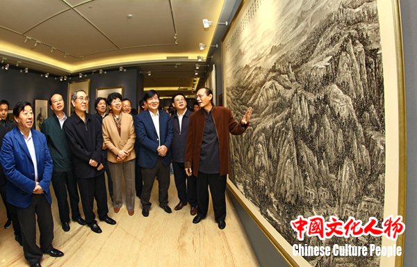 全国政协副主席马飚在中国文联党组书记、副主席赵实,中国文联党组副书记、副主席李屹,中国美术家协会副主席、中国美术馆馆长吴为山等领导的陪同下步入展览大厅 中新社发 王保胜 摄