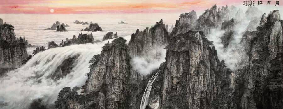 山水画题材的创作往往体现一位画家的整体水平。林浩湖先生的有些作品就只表现山谷和云,不涉及水瀑,又很贴切易经风水精神,这画画领域可以说不按常规。"山为筋骨,水为血脉,云烟为气韵;"可是他山水画中透露出的祥瑞之气,这在专家手里本来不易表现。一来容易被画理、画论所局限,一个是容易被经营位置所局限。理气派对风水有一段阐释;"山谷以藏风为贵,只要穴场藏聚,乘得生气.发达极快,何必拘泥有山无水..."而且山水画图式中"龙大脉小""太祖、少祖、明堂、朝案罗列清晰"不难做到,林浩湖先生还钻研五行之山在山水画中的创作.可以说这在画史上也是少见的。从而弥补了山水画类别的空白。是的,山水得气则生, "气韵生动"与风水学中的"藏风聚气"在他画作中几乎是体用兼备,理法自然了。虚实相生这是中国画内在的化生与画境高妙的体现。林浩湖先生对山水画的贡献不单是借虚衬实,他充分发挥了以刚柔见虚实,他提出了实处不离虚,如同黑中不离白,黑白的运行是相互作用的;古代名作无不在无画处求画意,通过万有的"无"来体现"有"的价值。易经中也常讲时空转换的智慧。他的山水画依托虚实来体现易经风水文化的价值。清代笪重光《画筌》云:"虚实相生,于无画处皆成妙境。"又讲:"今人用心在有笔墨处,古人用心在无笔墨处,倘能于笔墨不到处观古人用心,庶几拟议神明..."林浩湖先生作品《东方红》、《南梁革命根据地》、《延安颂》、《太行迎旭》等巨幅作品另人观后有种"真气内充,劲健含化"的感觉.山水画要得神首要是精于"计白当黑",从空无或虚白处生境,这对艺术家讲是"胸罗万象,感而会通".《易经》讲:"感而遂通天下之志,成其典要";在兵书讲:"形胜.";佛家讲:"一切唯心造";道家讲:"羽化而成仙";是古人对天地人三才的一种妙觉,其融会贯通后生命境界升华的呈现,犹如道家的"逍遥游"、佛家的"大自在"、儒家的"圆融通达"、画家的"造化于胸,随机而化" …