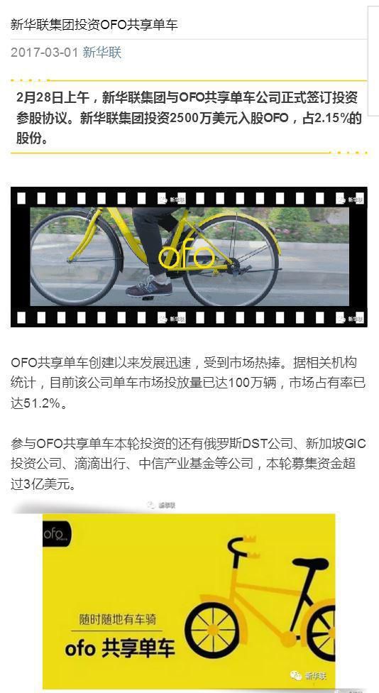 在ofo坚定地对外宣称融资4.5亿美元的同时,投资方新华联集团的官方微信公号上称: