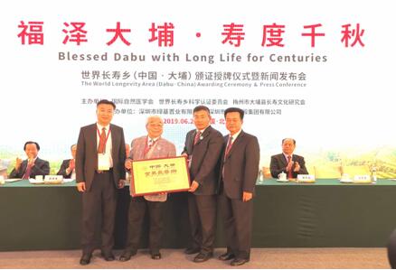 大埔县委书记朱汉东(右一)、大埔县政府县长熊锋松(左一)一起接受金色牌匾。北京讯6月28日上午,世界长寿乡(中国•大埔)颁证授牌仪式暨新闻发布会在北京举行,