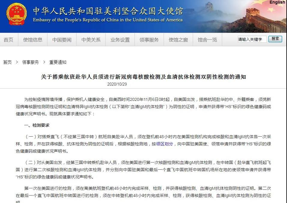 关于搭乘航班赴华人员须进行新冠病毒核酸检测及血清抗体检测双阴性检测的通知为控制疫情跨境传播,保护乘机人健康安全,自美西时间2020年11月6日0时起,自美国出发,