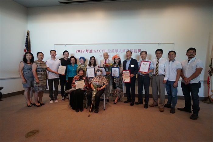 出席当天颁奖典礼的嘉宾合影蒙特利公园市(2022年9月1日)–南加州文化名人刘冰、华裔参政先锋黄赵企晨于9月1日下午在蒙特利公园市市立图书馆大厅内分别获颁“2022