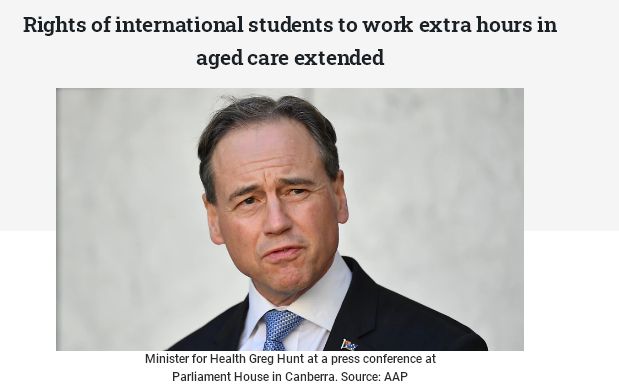 联邦政府30日表示,允许留学生在老年护理机构延长工作时间,使他们能够每两周工作超过40小时,此举旨在继续依靠留学生来帮助缓解老年护理机构工作者的压力。虽然此前