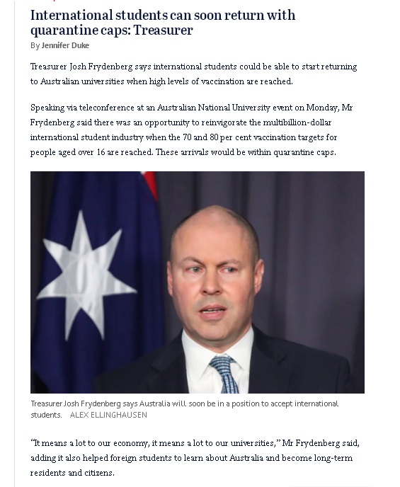 联邦财政部长弗莱登伯格(JoshFrydenberg)近日表示,当疫苗接种达到高水平时,国际学生将可以返回澳洲,接受线下授课。此外,弗莱登伯格还回应了气候问题,并表示将与中