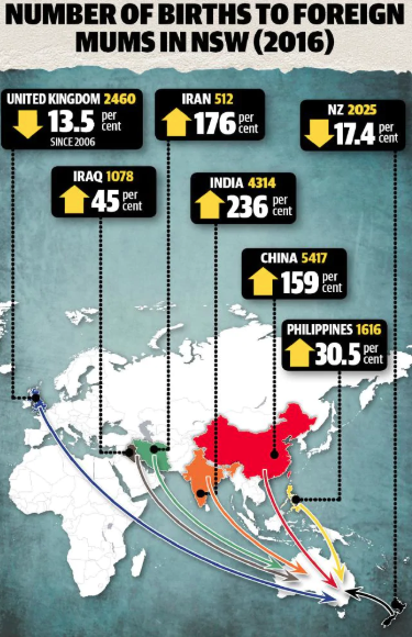 澳洲统计局(Australian Bureau of Statistics)数据显示,2016年新州共迎来96,083名新生儿,其中38.2%新生儿的母亲出生在海外。移民女性往往选择生育更多孩子。在2016年,黎巴嫩出生的女性生育率最高,人均有4.03个子女。 新州去年有超过三分之一的新生儿是由移民女性所生。(《每日电讯报》图片) 与此同时,土生澳人所生的新生儿人数却从2010年的65,923人降至2016年的59,348人,创下历史新低。他们生育率出现下降,从2006年的人均1.88个子女,降至2016年的1.79个。 在新州移民妈妈人数激增的背后,可以看到印度和中国母亲们的身影:截至2016年的10年间,出生在印度的女性,其生育的新生儿人数跃升了236%;而对于出生在中国的女性,她们所生的新生儿数量也增长了159%。 同期,新西兰及英国出生的女性,她们生育的新生儿人数却在下滑。 2016年移民女性生育新生儿的数量及10年间的增幅。(《每日电讯报》图片) 此外,统计局的数据还显示,2006年之后移民***迅速增长令人惊诧。对比1975年(首次统计相关数据)和2006年的数据,移民***人数仅增加约12%。 社会分析人士查尔克(David Chalke)称,这些数据揭示澳洲正在流失年轻的盎格鲁-撒克逊(Anglo-Saxon)女性。非英语背景的妈妈“不仅仅是取而代之”,数量还要更多。 “在许多移民群体的文化里,拥有很多孩子是更为适宜的。很大程度上,这是一种文化现象。” 面对移民女性引发的“婴儿潮”,联邦政府正考虑发起关于人口问题的参议院调查。 西澳自由党议员史密斯(Dean Smith)也正对同侪施压,要求他们展开为期一年、针对移民接收量和定居地的调查。根据有关数据,西澳41%的(新生儿)母亲出生在海外,比例全澳最高。 据悉,史密斯曾成功推动同性婚姻(立法),此后又在联盟党中带头推进过诸多有争议的事项。