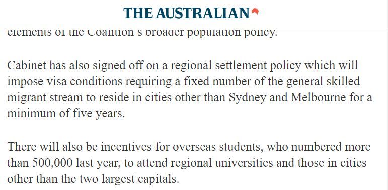 而怎么安抚因为移民政策变动而“流放”到悉尼和墨尔本之外的技术移民?前几天还有一个好消息: