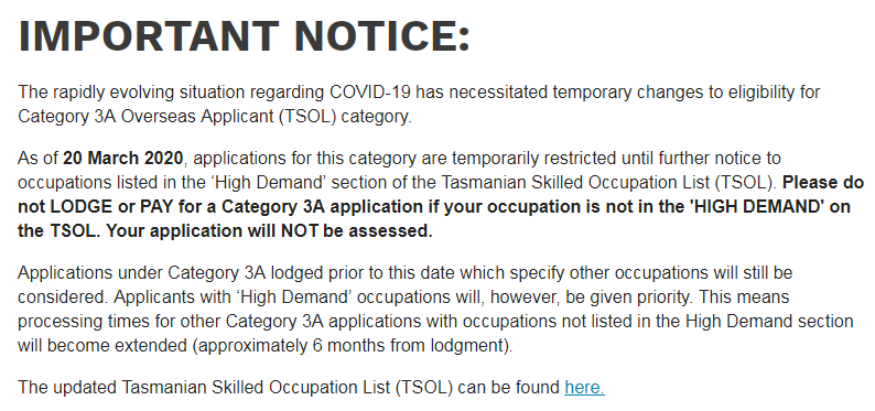 关于新冠病毒COVID-19疫情形势发展太快,TAS暂时更改3A类海外申请人(TSOL)类别的申请资格。