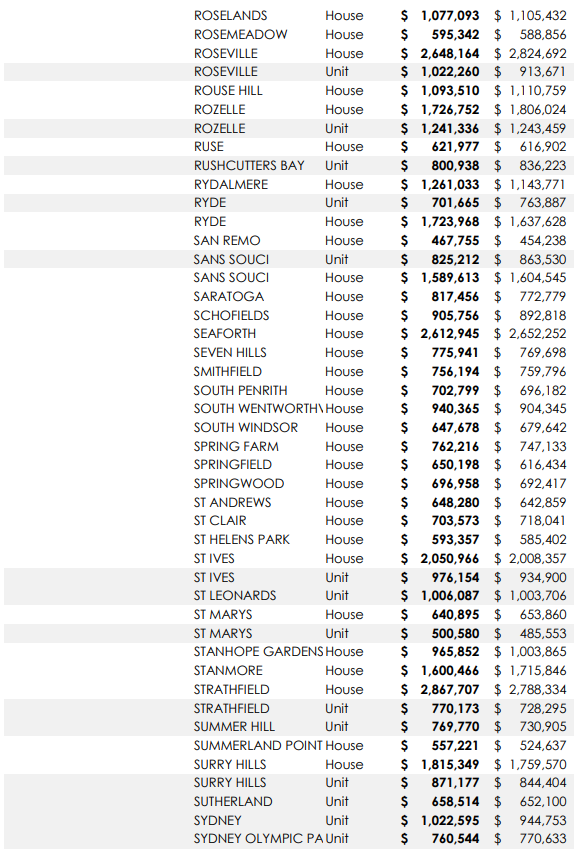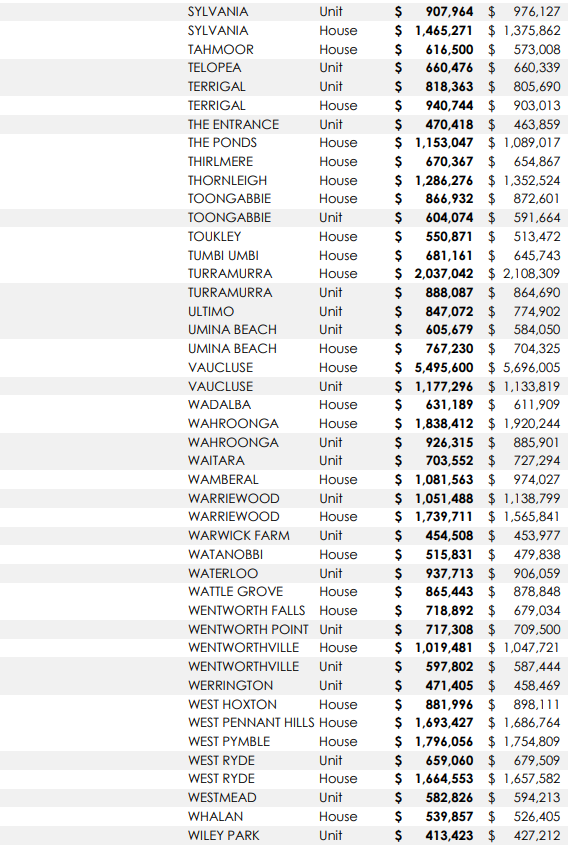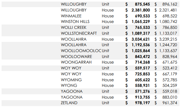 悉尼313个城区独立屋及公寓中位价一年涨跌情况