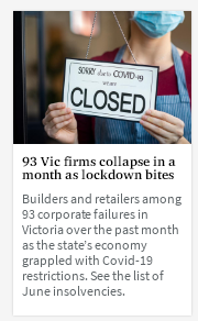 随着维州正在竭力应对新型肺炎疫情带来的经济停摆,维州6月至少有93家企业进入破产和管理阶段。