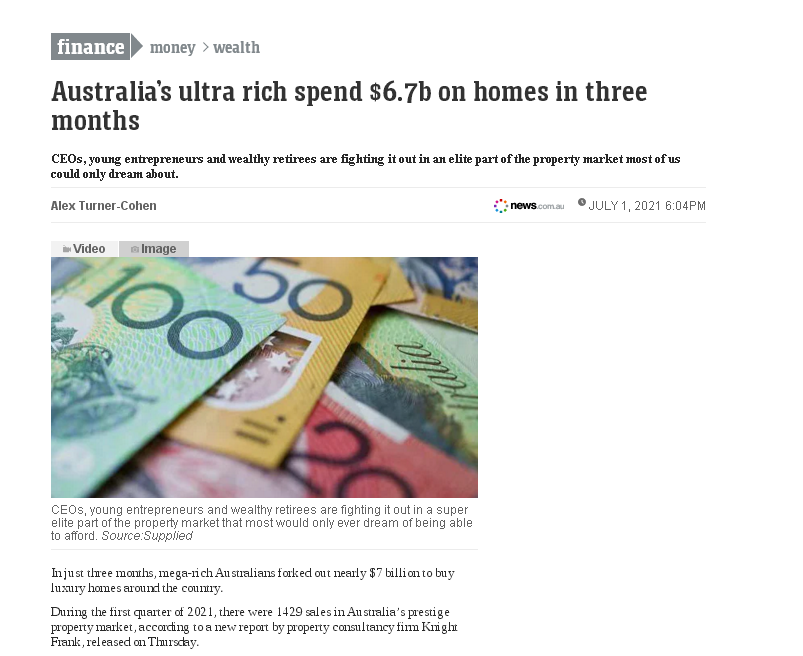 房地产咨询公司Knight Frank周四(1日)发布的一份新报告显示,在短短3个月内,澳洲的超级富豪们在全澳各地花费近70亿元抢购豪宅。