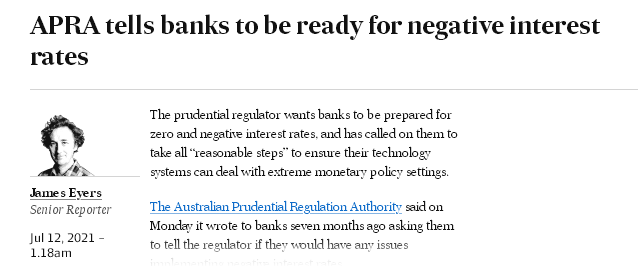 澳洲审慎监管局(Australian Prudential Regulation Authority)近日表示,希望澳洲各大银行可以为零利率和负利率做好准备,并呼吁它们采取一切“合理措施”,确保它们的技术系统能够应对极端的货币政策环境。