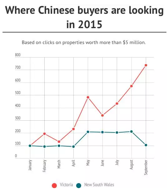 9月份的数据显示,中国买家对澳洲500万澳元以上房产的搜索记录大增,但却不是针对悉尼。Juwai网站的数据显示,中国买家对墨尔本豪宅的搜索量要比悉尼高出7倍。