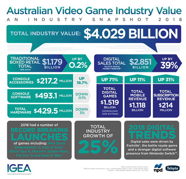 澳大利亚互动娱乐协会(InteractiveGames&EntertainmentAssociation,后简称IGEA)发布的报告显示,澳洲的游戏行业正在增长。2018年,澳大利亚电子游戏消费额达到