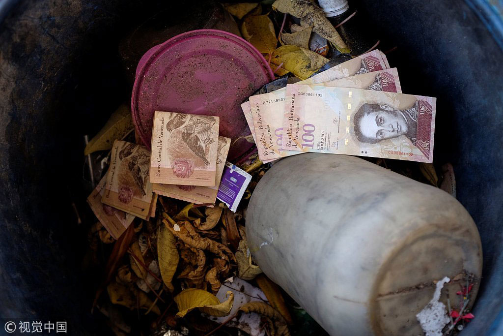 当地时间2018年8月20日,委内瑞拉加拉加斯,人们扔掉的钞票。委内瑞拉新货币主权玻利瓦尔(SovereignBolivar)正式亮相,准备与恶性通胀进行殊死一搏。