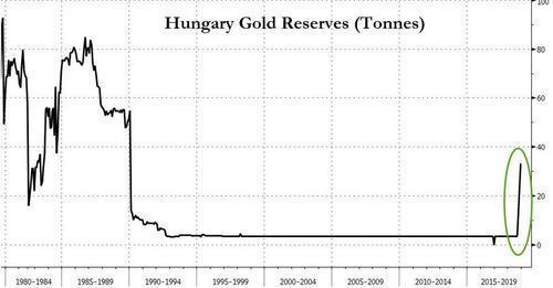 据彭博社数周前报道称,匈牙利央行已经宣布,该国的黄金储备从10月之前的3.1吨激增至31.5吨,或至原来10倍的水平,而这也是该国央行32年以来首次增持黄金,而更在今年3月份,匈牙利央行已经宣布要将黄金从伦敦提前遣返回国。