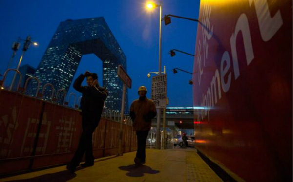 2015年11月,唐山,一名工人经过堆积如山的钢管旁。
