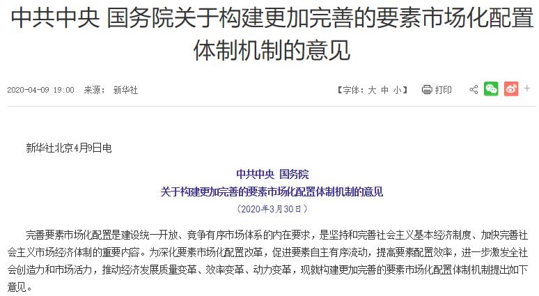 完善要素市场化配置是建设统一开放、竞争有序市场体系的内在要求,是新时代加快完善社会主义市场经济体制的重要内容。《意见》出台,是贯彻落实党的十九大和十九届四中全会的重要举措。