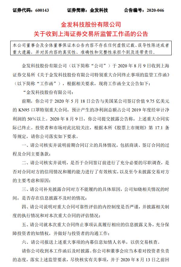 根据公告,公司于2020年8月9日收到上交所《关于金发科技股份有限公司特别重大合同终止事项的监管工作函》。监管函指出,前期,公司于2020年5月18日公告,与美国某公司签订价值9.75亿美元的KN95口罩特别重大合同,预计产生的净利润总额占公司2019年度经审计净利润的50%以上。2020年8月9日,公司提交披露公告称,上述重大合同实际已终止。