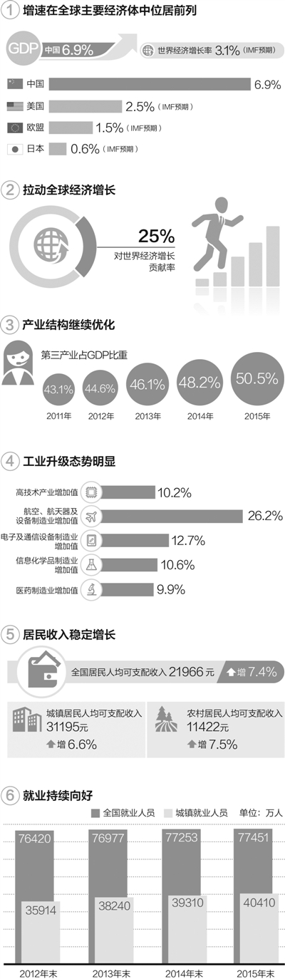 科技创新更给力。2015年,我国高技术产业的增加值增速比规模以上工业高4.1个百分点;全社会研发支出比2010年大约增长了一倍,科技进步贡献率从2010年的50.9%提升到2015年的55.1%,经济增长的科技含量越来越高。
