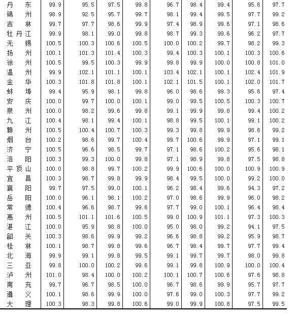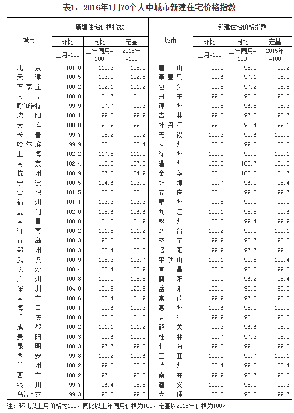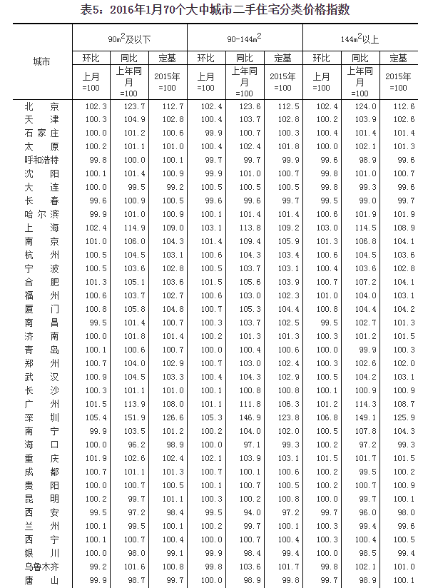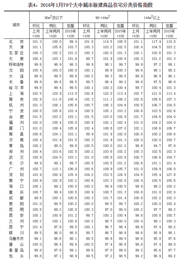 7、按照统计制度安排,70个大中城市住宅销售价格统计调查每五年进行一次基期轮换,2016年1月开始使用2015年作为新一轮的对比基期。新基期对各分类权数进行了适当调整,以更好地反映住宅销售结构的变化情况。经测算,本轮基期轮换对各城市房价环比指数基本无影响,对同比指数影响也较小。