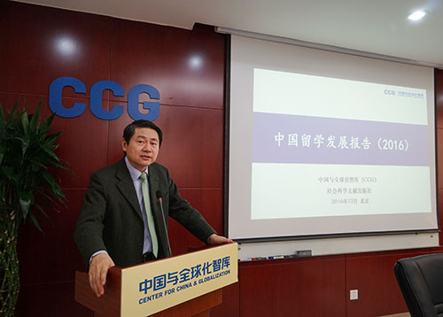 中国与全球化智库(CCG)主任王辉耀致辞。(付强摄)中新社北京12月12日电(付强)《中国留学发展报告(2016)》蓝皮书12日在京发布。报告围绕全球化时代中国留学和来华留