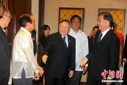 当地时间17日,汪洋与菲律宾财政部长多明计斯等内阁经济管理团队成员举行会谈。图为会谈开始前汪洋与多明计斯等人握手。中新社马尼拉3月18日电(记者张明)正在菲律