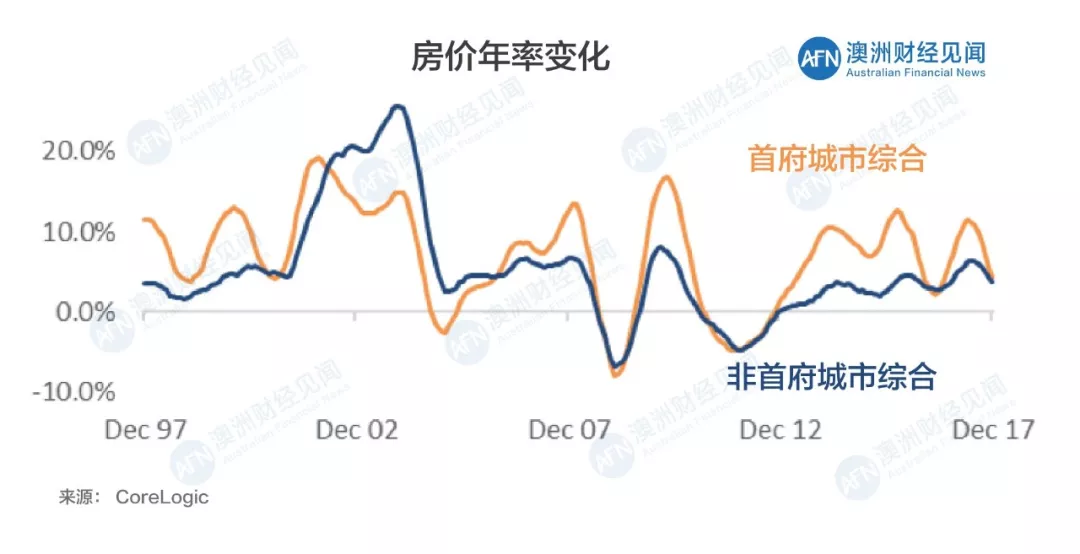 从整个澳洲范围内来看,澳洲住房价格的下滑主要是由于首府城市下跌导致的。第四季度,首府城市房价同比下滑了0.5%左右,而其他城市房价较上季度则上涨了0.5%。