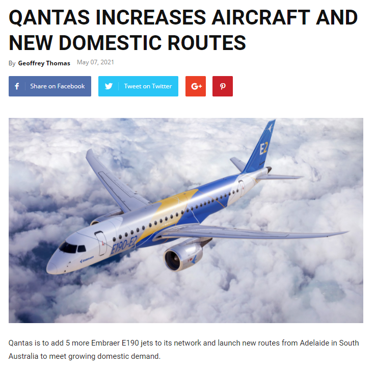 澳航将开通从南澳阿德莱德出发的新航线。澳航(Qantas)将增加5架EmbraerE190喷气式飞机,开通从南澳阿德莱德出发的新航线,满足日益增长的国内游客需求。Airlinerat