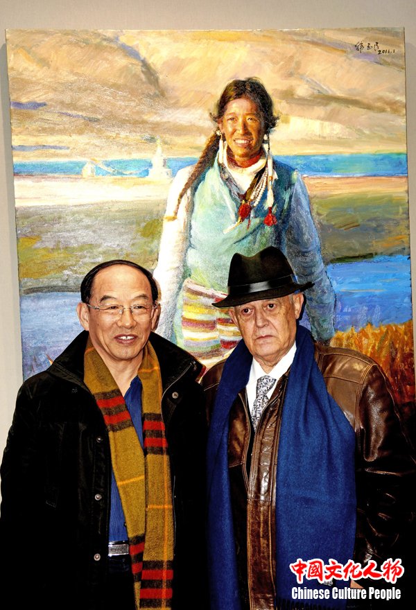 韩玉臣与法国著名美术评论家杰拉德·古西格拉在作品《圣湖桑珠》前合影