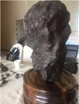 除了山河平川, 杜俊平还经常在老家峨眉山市和乐山奇石古玩城寻觅,在一个偶然的机会,有个石农拿着一个石头在街边叫卖,他上前去一看,发现有个石头很奇特,就把它买了下来。他这个石头去山东莒南国际陨石协会去检测,检测结果让他非常高兴,这是一块无磁,稀有的金属陨石,具有极高的收藏价值、观赏价值,属于国宝级了。