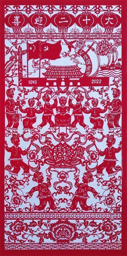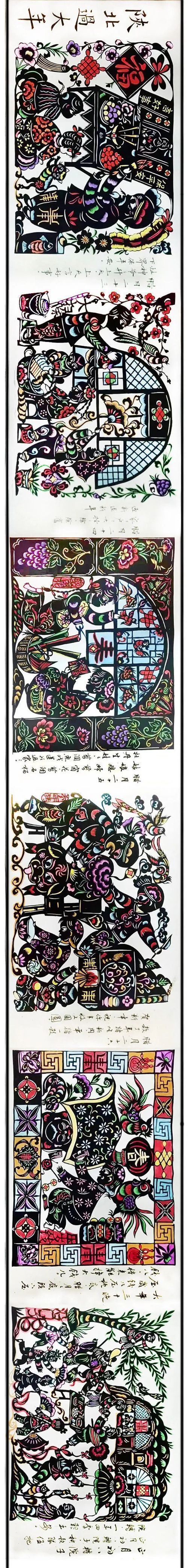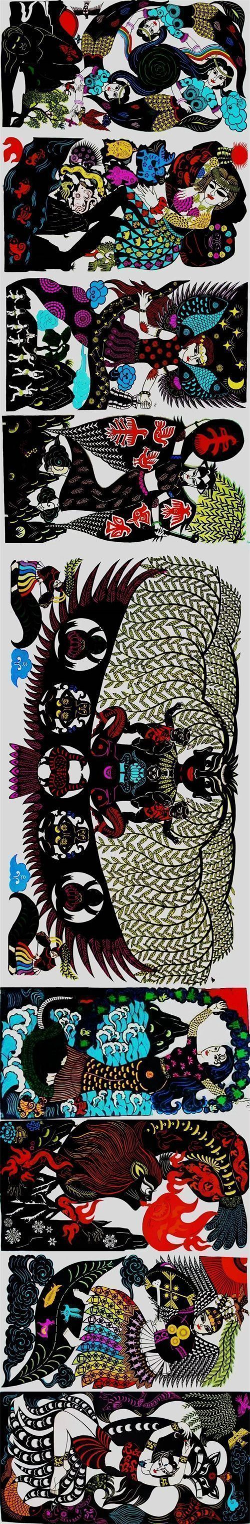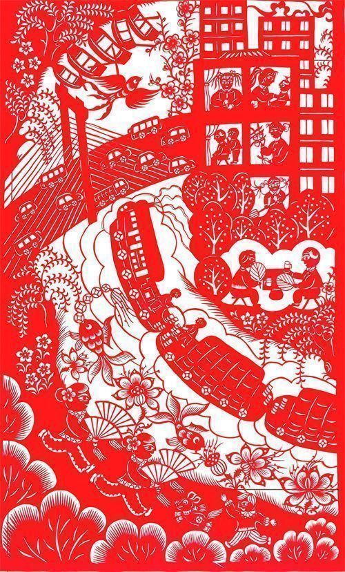 为了让大家了解真正的中国现代民间剪纸,我在这里选发近年来一些民间剪纸传承人创作的现代民间剪纸作品,供大家欣赏。这些传承人,大多是民间的农民或出身于农民家庭的知识分子,他们紧跟时代的步伐,在继承传统民间剪纸基础上努力创新。例如:陕西的余泽玲、李福爱、高玉兰、孙菁霞、李志梅、孟梅芳、郭佩珍、吴锦珍、曹毛女、李淑琴、李凤英、陈艳芬、郑飞燕、张玉芳、杨秀勤;山西的王计汝、崔春梅、郭润芝、杨毅、张善东、王春秀;内蒙的伍永娟、吕凤英;山东的齐秀花、任凭、黄玉华、陈淑香;宁夏的伏兆娥、赵文花;河南的畅杨杨、杨庆锋;甘肃的惠富君、曹永琴、成雪琴、段喜娥、张雪峰、马路、段彩霞、安惠玲、赵兴萍;安徽的程兴红;河北的石俊凤等等,他们是新一代有文化的民间剪纸传承人。从小都受到妈妈、奶奶的传授熏陶,打下了扎实的传统文化和民间剪纸的基础。由于长期生活在农村乡镇,熟悉农村乡镇生活,加之接受了城市文化和现代生活的影响,在内容、形式、材料上,都进行了大胆的创新,创作了不少反映农村现代生活题材和主题的民间剪纸,既传统,又时尚,发展为新一代现代民间剪纸,成为中国现代民间剪纸引领的先锋主力军,也是中国现代民间剪纸发展的方向。例如:郭佩珍的《乡城一片好风光》,此作品是郭佩珍在77岁到82岁耗时五年完成的精品之作。长13米宽90厘米。作品从自己居住的地方开始把佳县古城到白云道观完整剪在纸上,佳州古城整体坐落在山峰,黄河在县城脚下汤汤而过,白云道观整体的庙宇建筑全部剪于纸上(白云道观是中国西北地区最大的道观),作者生活在黄河岸边,作者把自己在生活中的所见所闻整体的表现在纸上。作品内容丰富,全面展现了黄河岸边人们的生活和民俗,同时也能了解当地道教文化。看过作品的人惊叹敬佩使人犹如亲临佳县。