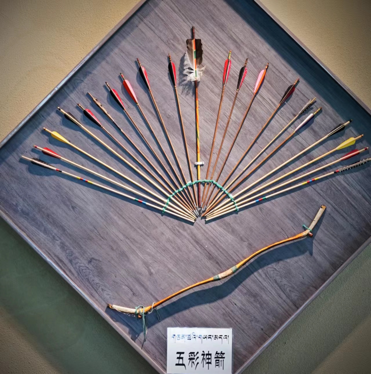 “五彩神箭的五种颜色,红色代表活力,黑色代表力量,黄色代表富裕,蓝色代表关怀,绿色代表和平,五种颜色代表的品质,承袭着藏族英勇无畏的血脉。”五彩神箭省级非遗传承人久美多杰说。